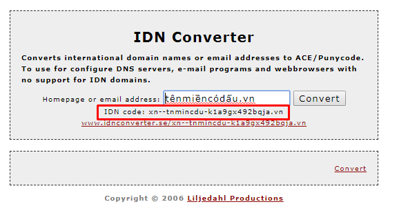 Nhập tên miền có dấu vào khung nhập liệu, tiếp đó ấn "Convert " để chuyển sang mã ASCII